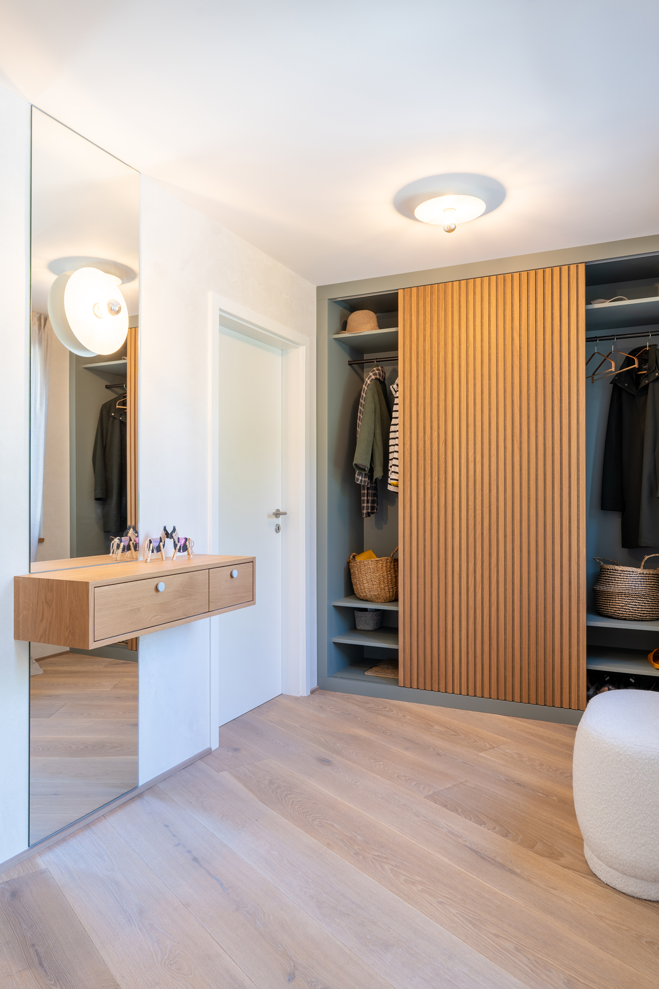 Einzelne, gezielte Maßnahmen sollen das Haus optisch aufwerten und es sowohl bewohnerfreundlicher als auch energieeffizienter machen. Im Erdgeschoss öffnet sich der Essbereich großzügig über eine Schiebetür-Front zur neuen Veranda. Die Gestaltung erinnert an ein Schiffsdeck und vermittelt eine subtile Ferienstimmung. Als hätte das Schiff hier angelegt, führt eine ausladende Treppe in den kleinen, gemütlichen Garten – ein Ort der Entspannung.